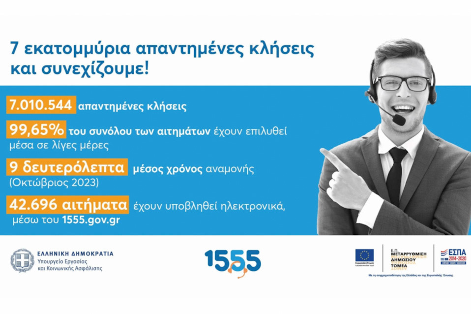 Πάνω από 7 εκατομμύρια κλήσεις έχει εξυπηρετήσει στους 27 μήνες λειτουργίας του το 1555, ο Ενιαίος Αριθμός Εξυπηρέτησης Πολιτών του Υπουργείου Εργασίας και Κοινωνικής Ασφάλισης.
